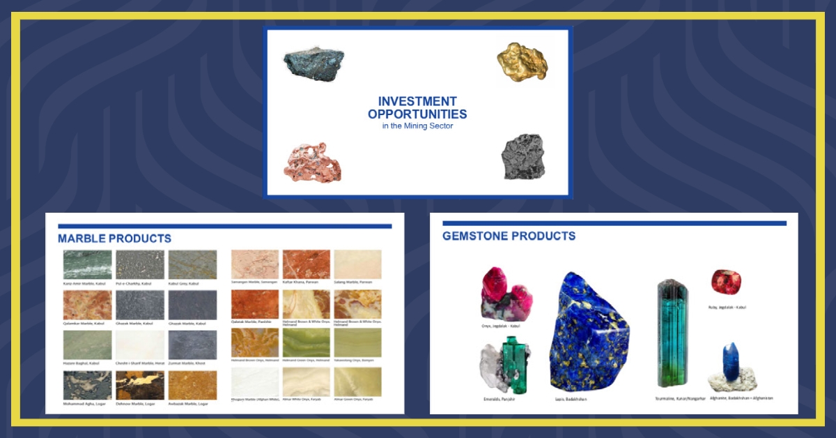 On July 08, 2021, the Ministry of Mines and Petroleum (MoMP) of Afghanistan announced 21 large-scale mining projects for investment. The projects’ commodities include gold, copper, gemstone, cement, marble, granite, and travertine. We highly encourage the potential investors/companies to visit the MoMP webpage and review the brief pitchbooks on every project. We will be happy to connect the investors with the relevant department at MoMP and facilitate their visit to Afghanistan for the next steps in this regard.