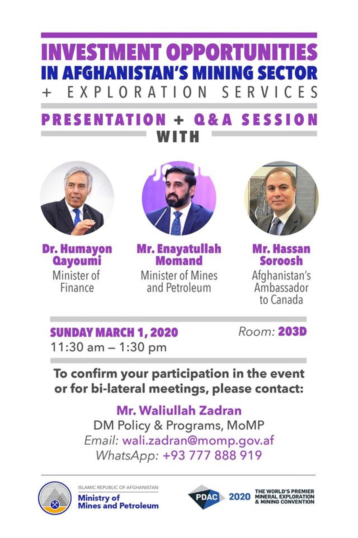 Afghan delegation will host a side event on Investment opportunities in Afghanistan's mining sector and exploration services at the PDAC convention.