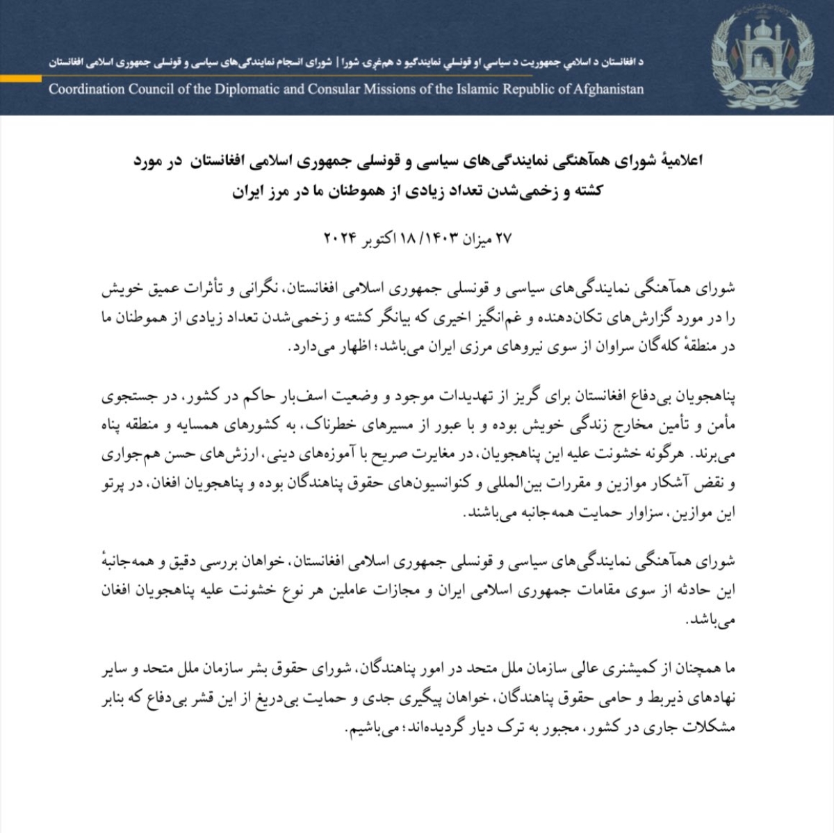 اعلامیهٔ شورای همآهنگی نمایندگیهای سیاسی و قونسلی جمهوری اسلامی افغانستان در مورد کشته و زخمیشدن تعداد زیادی از هموطنان ما در مرز ایران