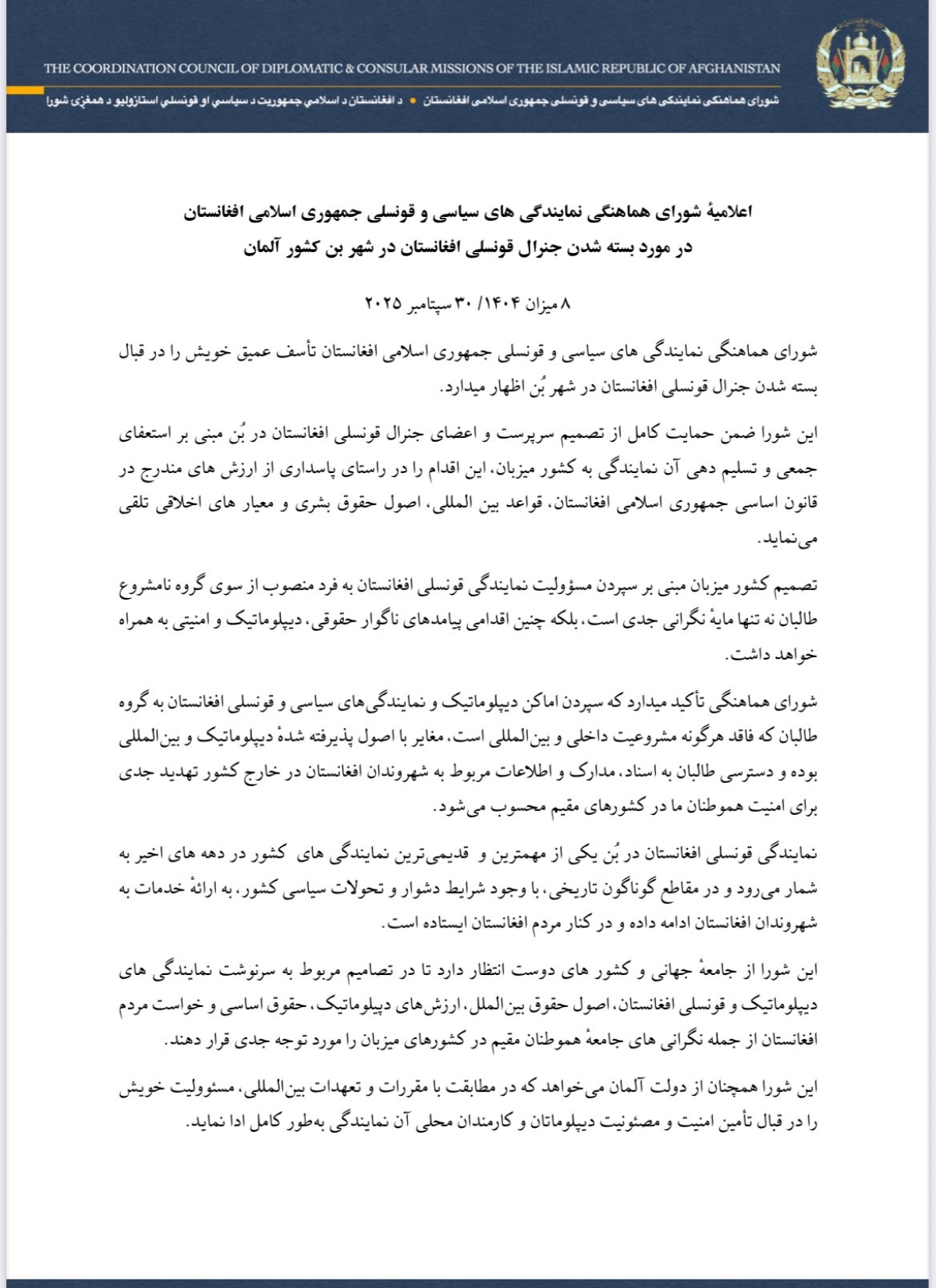 اعلامیهٔ شورای هماهنگی نمایندگی های سیاسی و قونسلی جمهوری اسلامی افغانستان در مورد بسته شدن جنرال قونسلی افغانستان در شهر بن