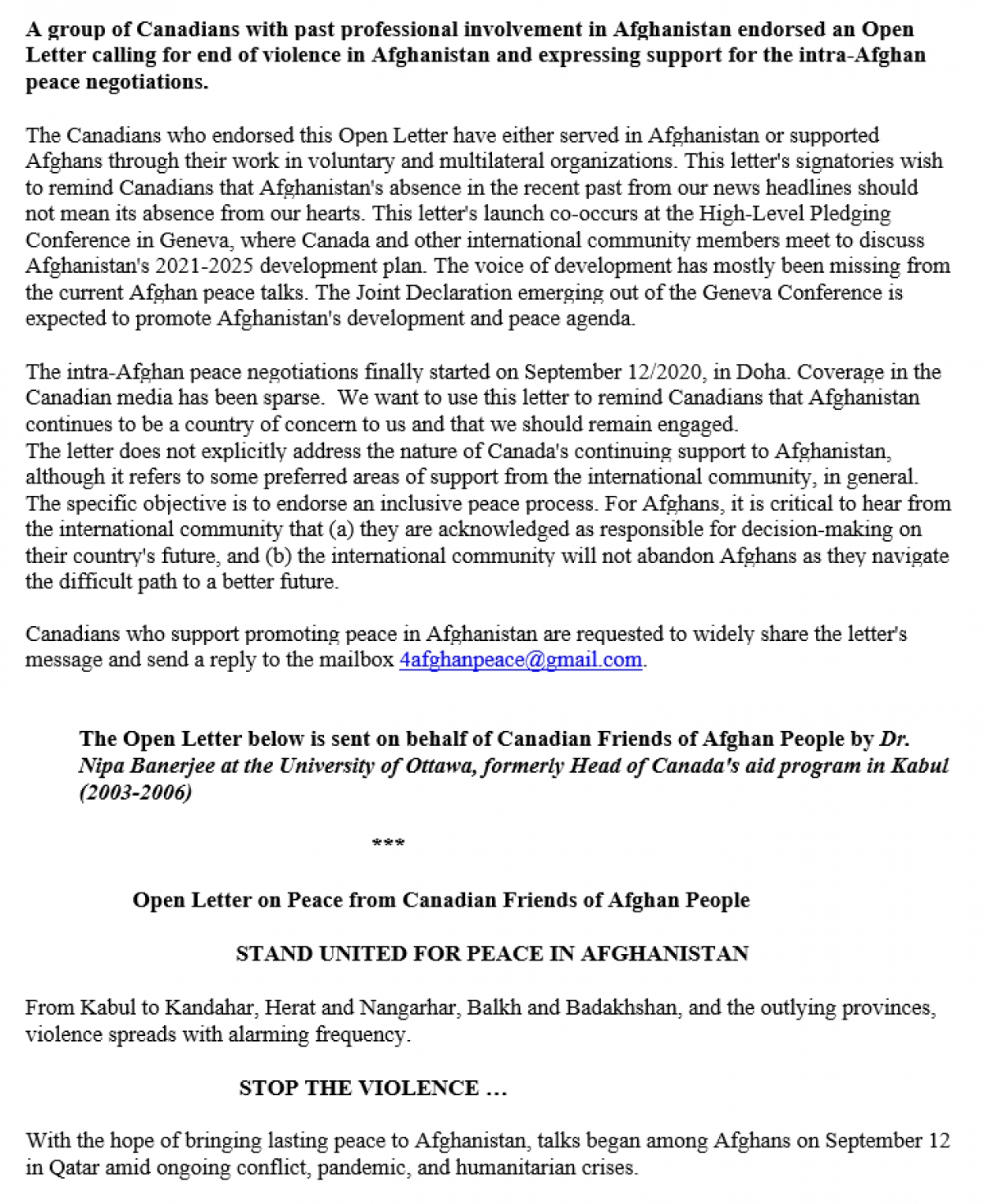 Canadians who support promoting peace in Afghanistan are requested to widely share the letter’s message and send a reply to the mailbox This email address is being protected from spambots. You need JavaScript enabled to view it..