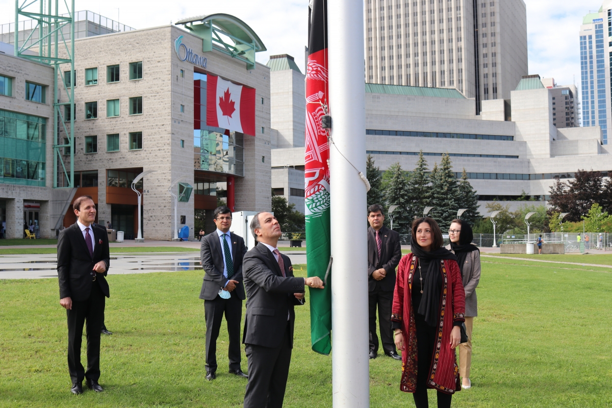 Ambassador Hassan Soroosh, along with the family and embassy staff, raised the national flag at the Ottawa city hall this morning, honoring the 101st anniversary of the restoration of Afghanistan’s independence.