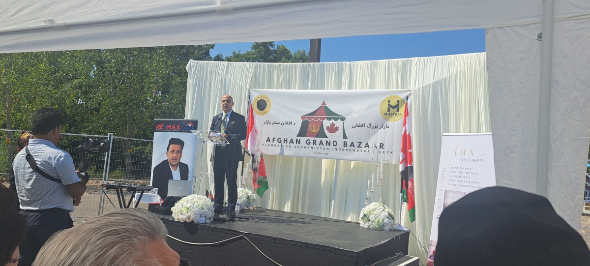 On August 16, 2025, Ambassador Hassan Soroosh participated in and delivered remarks at the opening of the Afghan Grand Bazaar in Whitby, one of the flagship events marking the anniversary of Afghanistan’s restoration of independence.