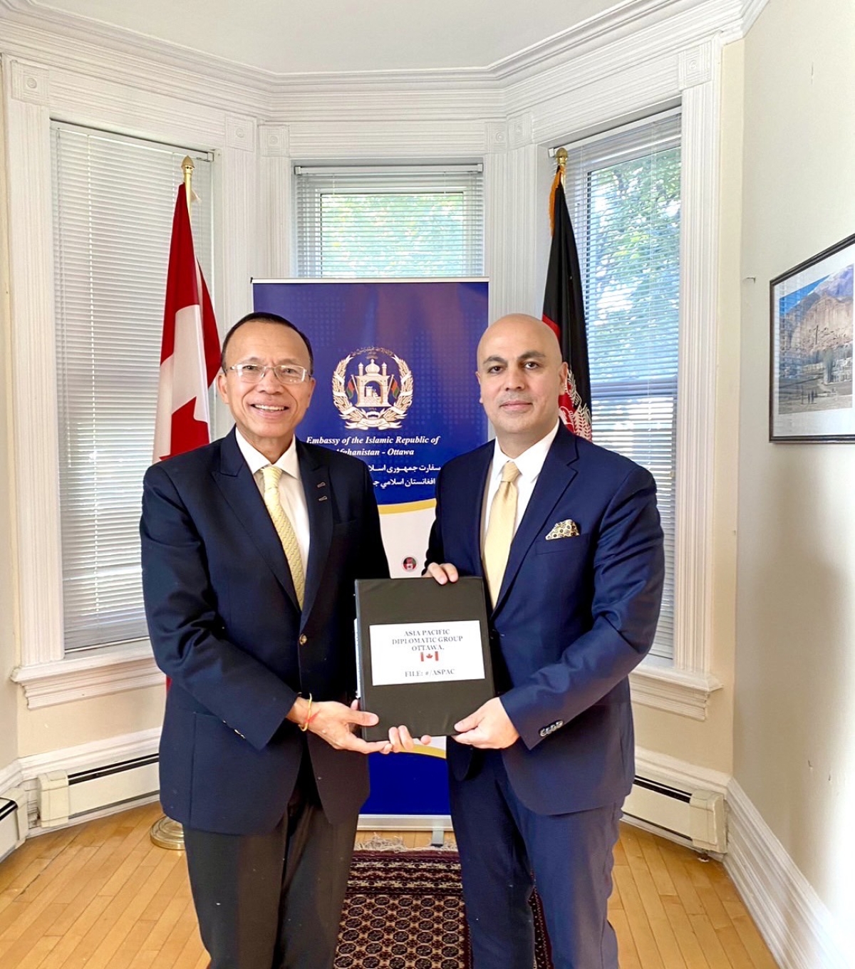 During a meeting at the Embassy of Afghanistan in Ottawa, Ambassador Hassan Soroosh officially handed over the deanship of the Asia Pacific Diplomatic Group to H.E. Kallayana Vipattipumiprates, Ambassador of Thailand to Canada. Ambassador Soroosh wished Ambassador Vipattipumiprates every success during his deanship.