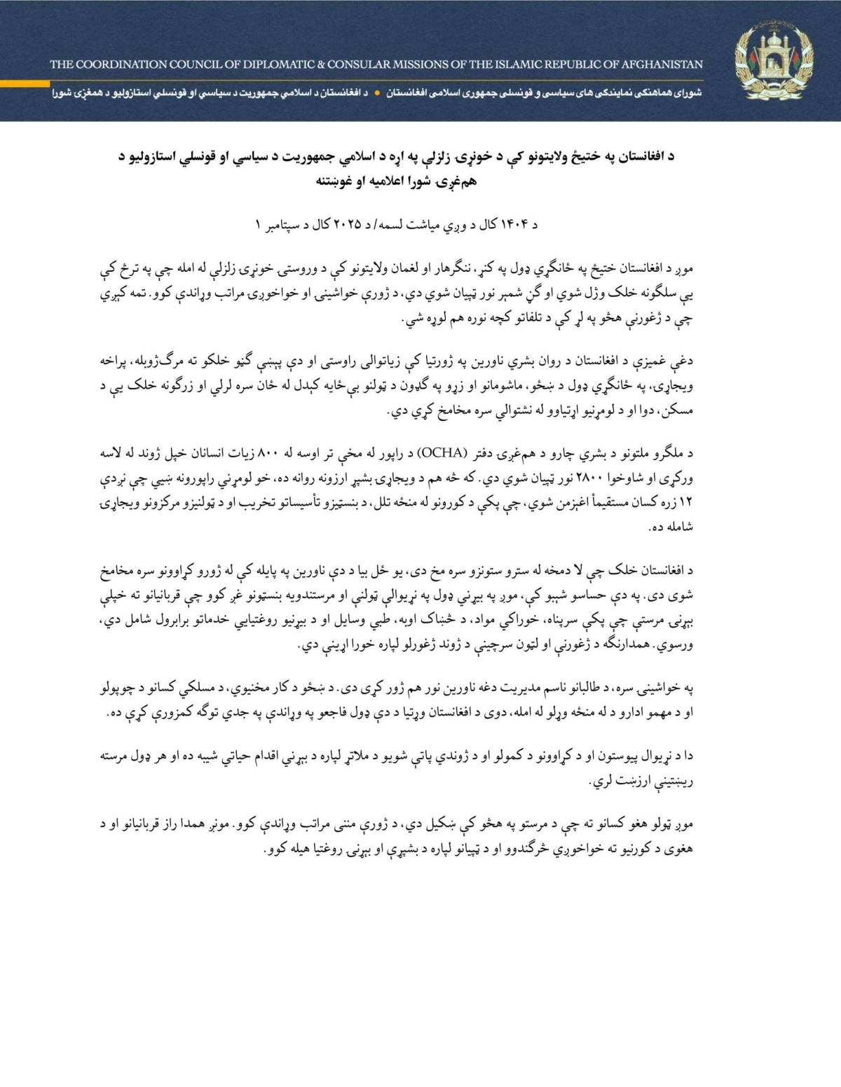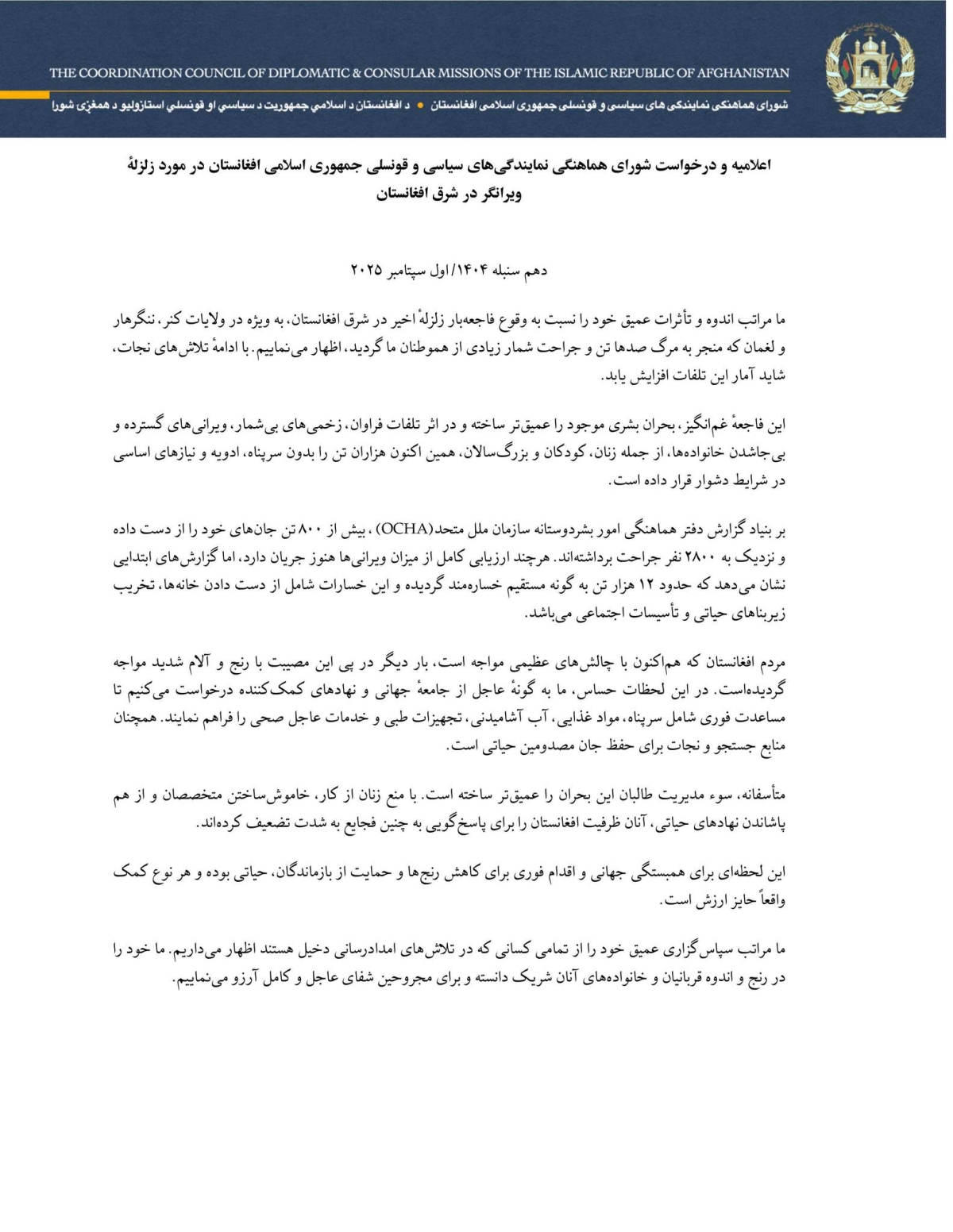Statement and Appeal of the Coordination Council of the Diplomatic and Consular Missions of the Islamic Republic of Afghanistan on the Devastating Earthquake in Eastern Afghanistan