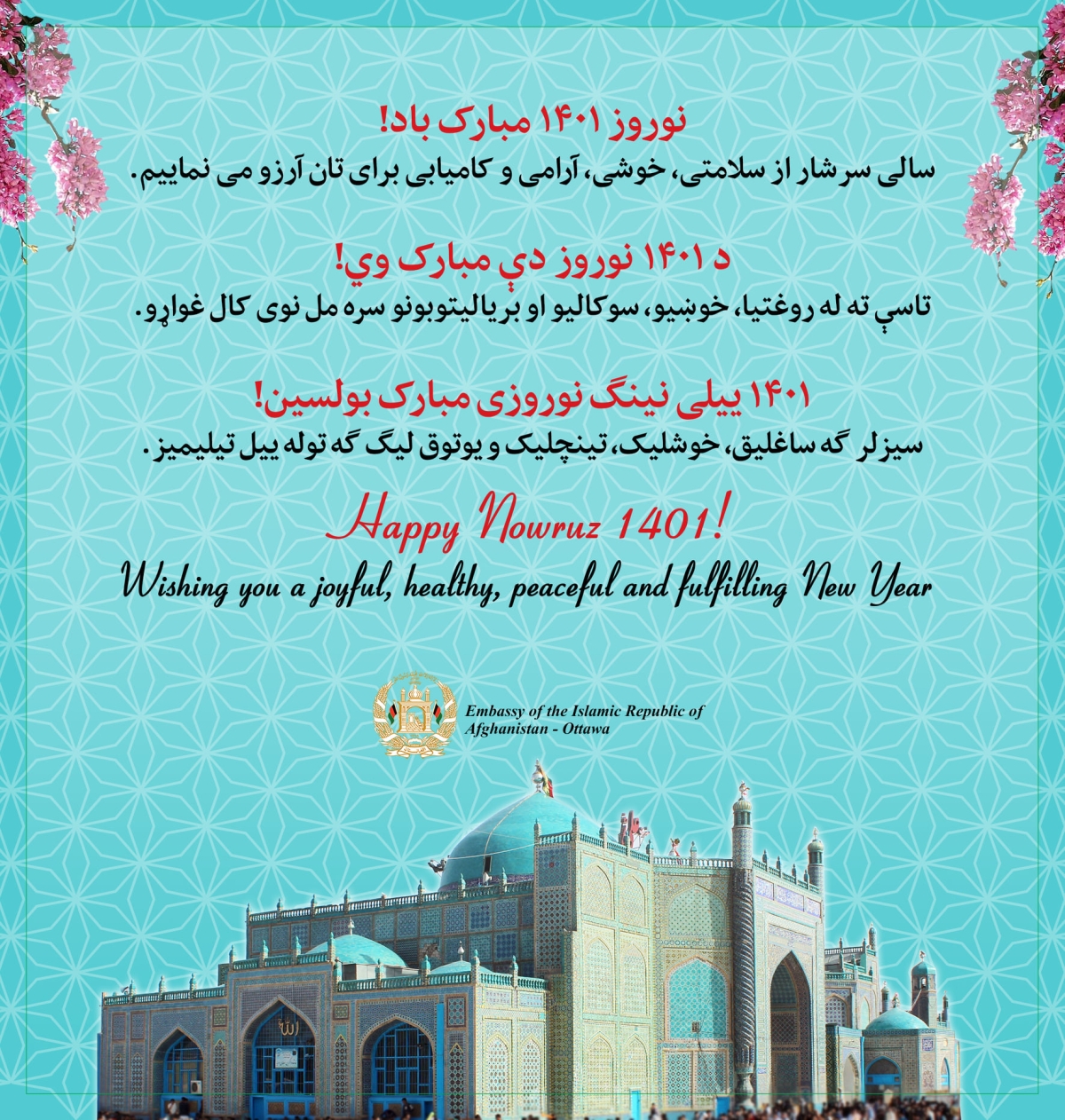 This is the official website of the Embassy of the Islamic Republic of Afghanistan in Ottawa - Canada. External links to other Internet sites should not be construed as an endorsement of the views or privacy policies contained therein.