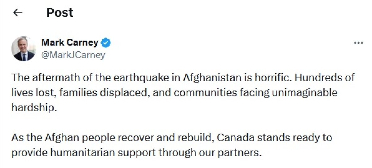 Earlier on X, Ambassador Hassan Soroosh wrote the following on Canada's response to the devastating earthquake in Eastern Afghanistan: