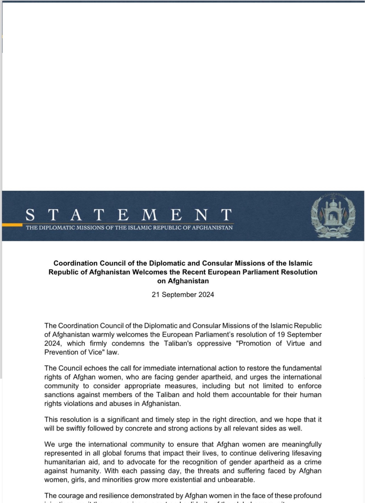 The Coordination Council of the Diplomatic and Consular Missions of the Islamic Republic of Afghanistan Welcomes the Recent European Parliament Resolution on Afghanistan