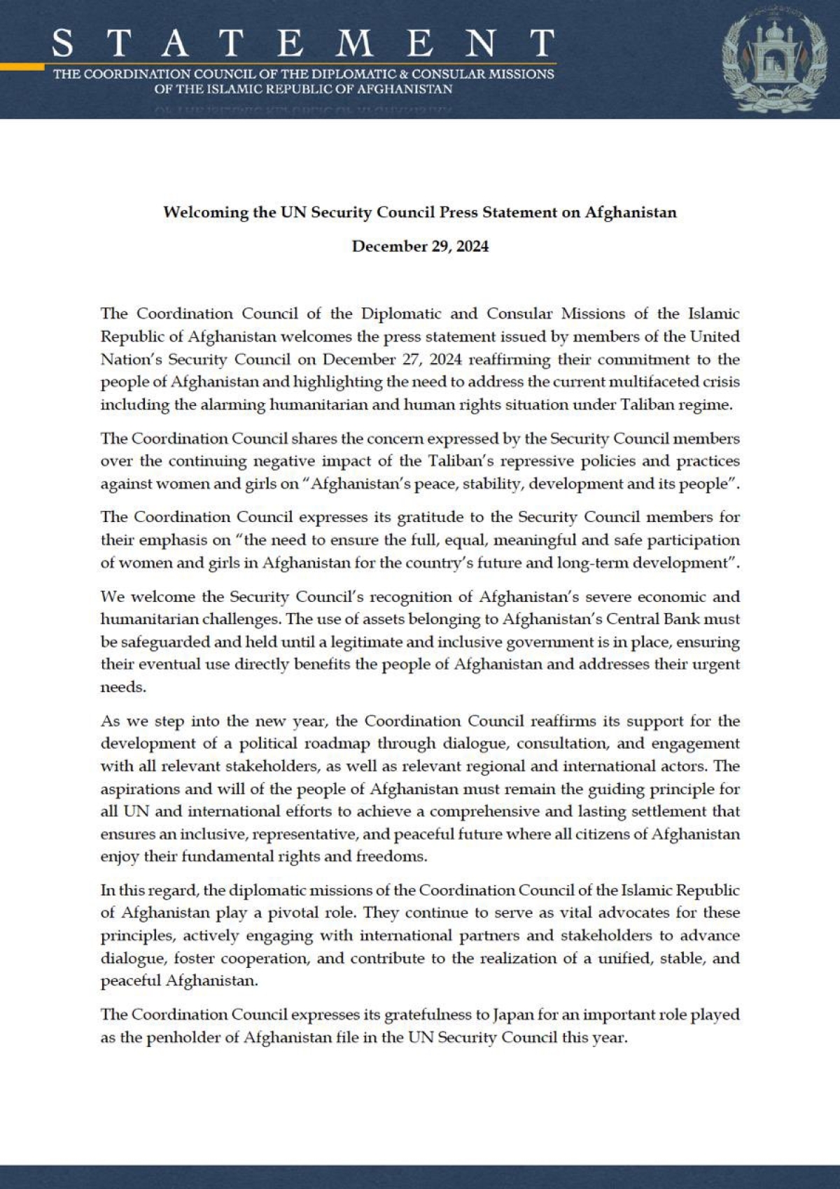 Statement by the Coordination Council of the Diplomatic and Consular Missions of the Islamic Republic of Afghanistan Welcoming the UN Security Council Press Statement on Afghanistan
