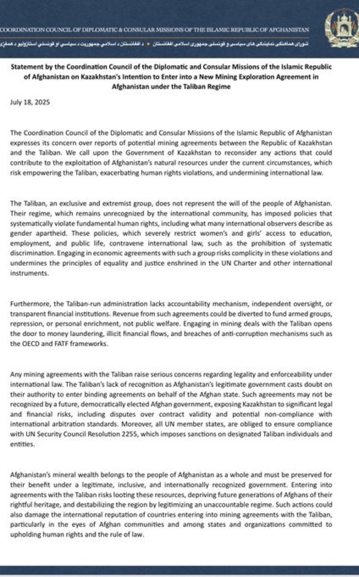 Statement by the Coordination Council of the Diplomatic and Consular Missions of the Islamic Republic of Afghanistan on Kazakhstan's Intention to Enter into a New Mining Exploration Agreement in Afghanistan under the Taliban Regime
