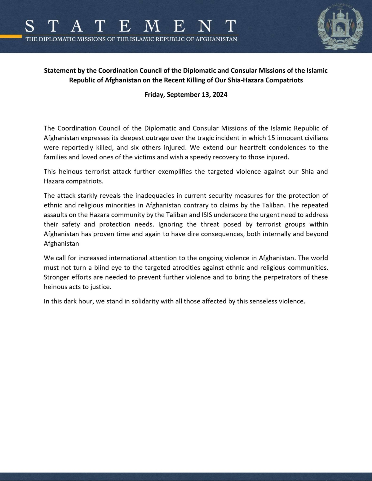 Statement by the Coordination Council of the Diplomatic and Consular Missions of the Islamic Republic of Afghanistan on the Recent Terrorist Attack Targeting Our Shia-Hazara Compatriots