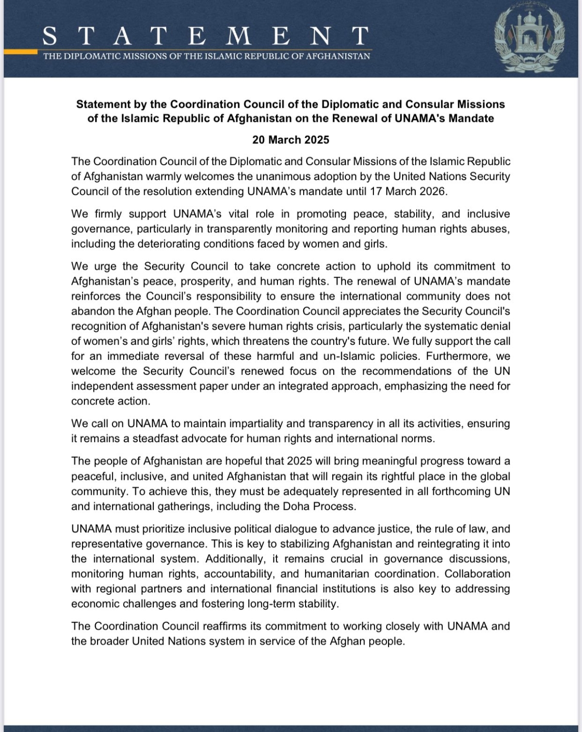 Statement by the Coordination Council of the Diplomatic and Consular Missions of the Islamic Republic of Afghanistan on the Renewal of UNAMA's Mandate