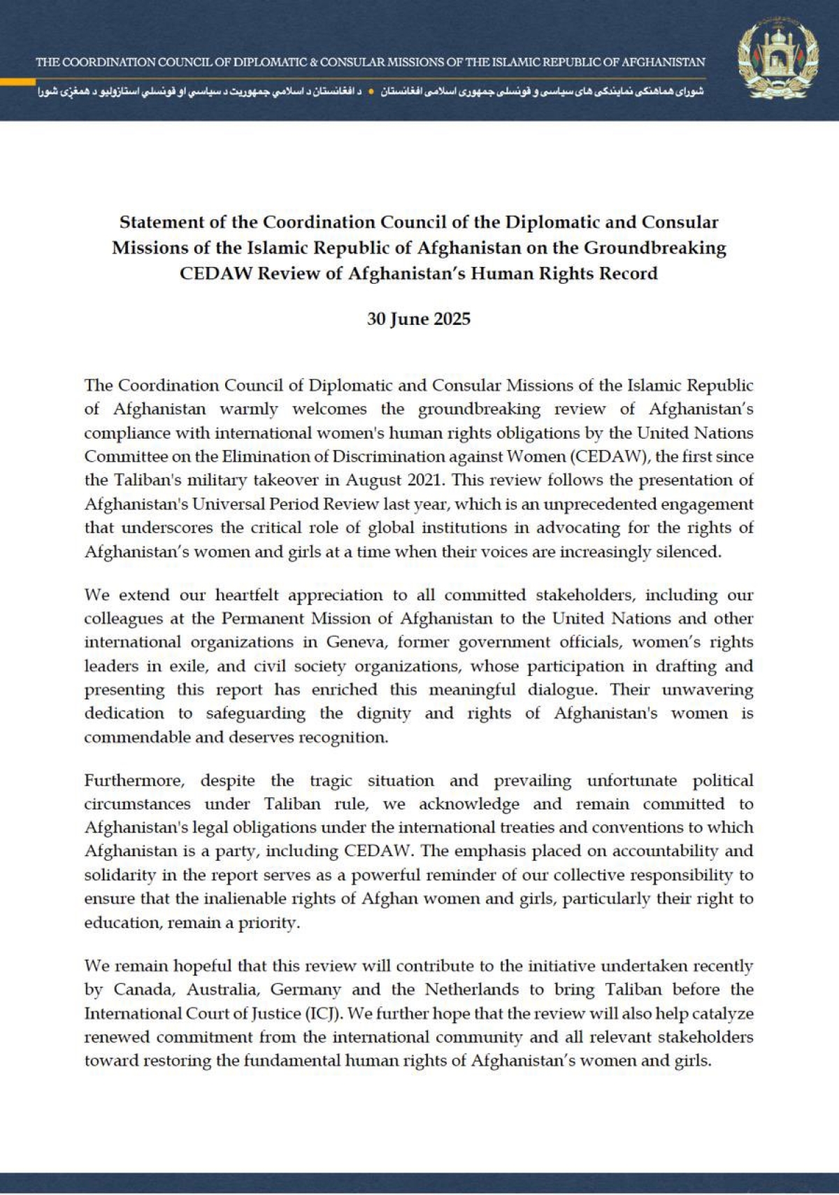 Statement of the Coordination Council of the Diplomatic and Consular Missions of the Islamic Republic of Afghanistan on the CEDAW Review of Women's Rights Situation under the Taliban Regime