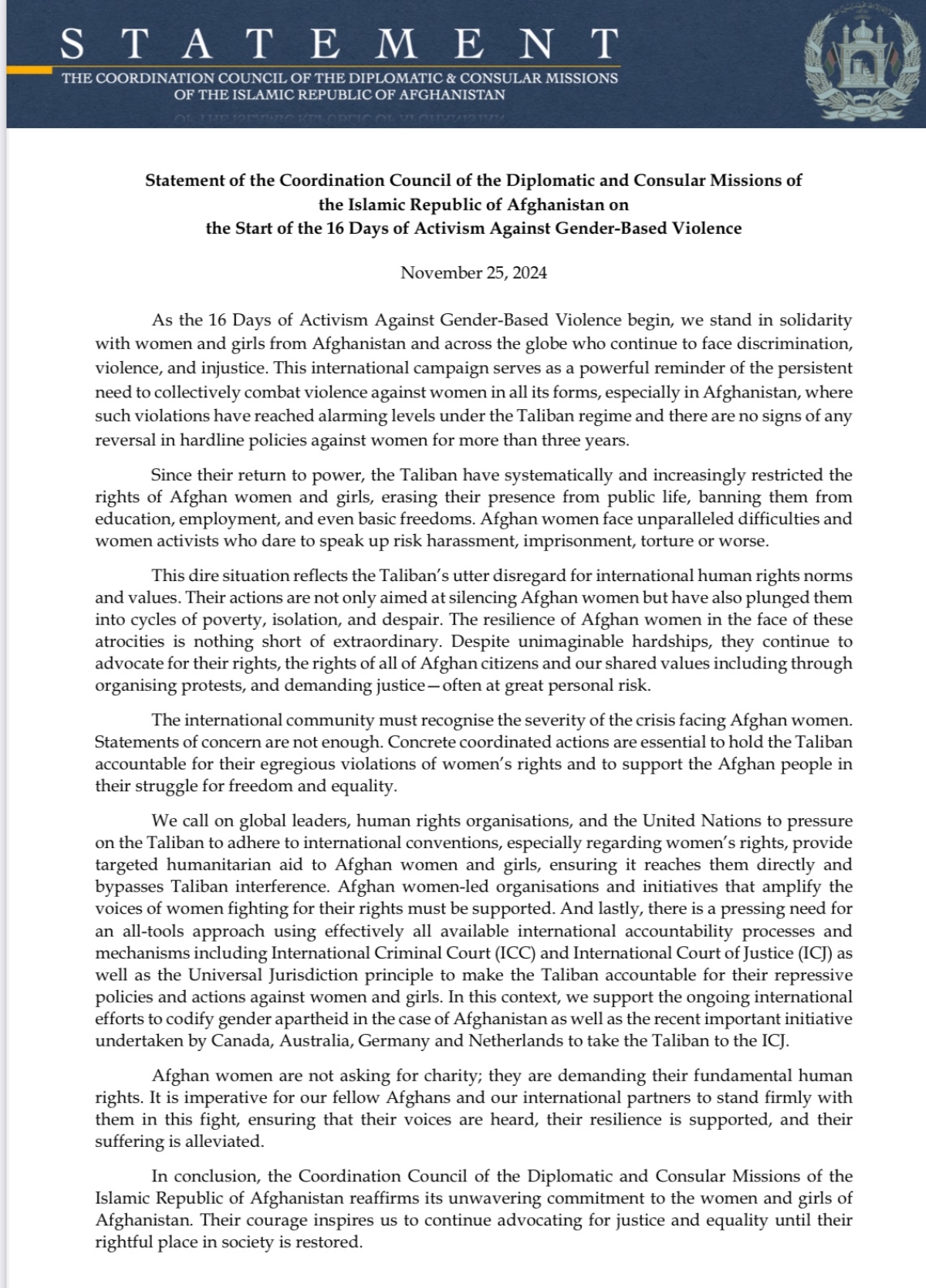 Statement of the Coordination Council of the Diplomatic and Consular Missions of the Islamic Republic of Afghanistan on the Start of the 16 Days of Activism Against Gender-Based Violence