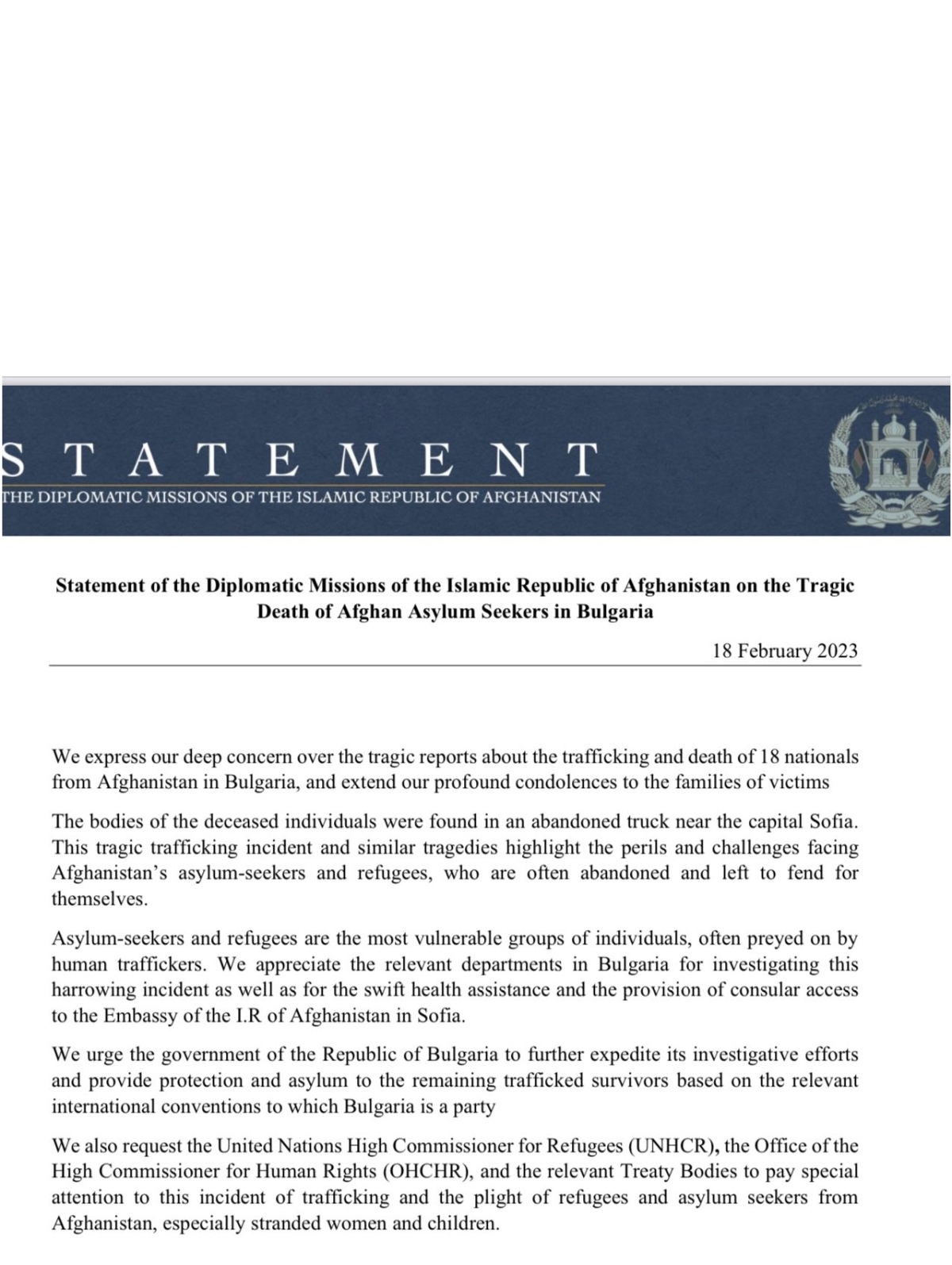 STATEMENT OF THE DIPLOMATIC MISSIONS OF THE ISLAMIC REPUBLIC OF AFGHANISTAN ON THE TRAGIC DEATH OF AFGHAN ASYLUM SEEKERS IN BULGARIA